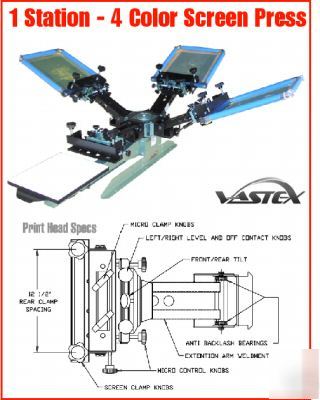 (You will need acrobat reader installed to view the above files) CLICK HERE TO GET ACROBAT READER 8.0 Vastex 1 Station 4 Color Professional Screen Press Vastex rules the industry with presses and dryers for textile screen printers. Quality equipment backed by the BEST warranties in the industry. Superior equipment designs based on over 40 years of experience. Expandable/upgradable printers that will grow with your business. Vastex printers have all steel welden construction, including the pallets. . .designed for printing garments with stunning precision. All parts are fabricated and completely assembled in Allentown, PA. No backlash print-head pivot bearings and tapered roller bearings and built around the largest center shaft in the industry. Dual ball bearings, located as close to the print head as possible, locking around a steel locator on each arm. Six way leveling of the print heads, micro-registration and massive steel screen back clamps. That is why Vastex Rules. we carry ever shape and size to fit your shops need! V2HD-11-T / 1 Color - 1 Station Table Top. . . .$729.90 . .No Crating V2HD-12-T-4 / 2 Color - 1 Station Table Top. . . .$1,430.16 . .No Crating V2HD-14-T / 4 Color - 1 Station Table Top. . . .$1,932.64 . .No Crating V2HD-16-T / 6 Color - 1 Station Table Top. . . .$2,938.24 . .No Crating V2HD-24 / 4 Color - 2 Station . . . .$2733.24 . .No Crating V2HD-24 / 4 Color - 4 Station . . . .$3186.00 . .No Crating V2HD-24 / 6 Color - 4 Station . . . .$3,944.56 . .No Crating V2HD-24 / 6 Color - 6 Station . . . .$4,683.76 . .No Crating V2HD-24 / 8 Color - 4 Station . . . .$5,048.08 . .No Crating V2HD-24 / 8 Color - 8 Station . . . .$6,104.64 . .No Crating V2HD-24 / 10 Color - 10 Station . . . .$7,742.72 . .No Crating SERVICE IS THE DELIVERY OF A PRODUCT HOSPITALITY IS HOW THE DELIVERY OF A PRODUCT MAKES ITS RECIPIENT FEEL. We leave positive feedback once you have done so. This let's us know we have done the job to your satisfaction. Please contact us, we can resolve any problem that may arise with your order. * If you do not see it in our store, email us, we can find it for you. * Returns are accept up to 5 days upon receipt of item. Simply return the item for a full refund if not satisfied with the product. Please feel free to contact us with any questions! Email Us at: Phone # , Fax # SUPPLIER TO SUCCESSFUL SCREEN PRINTERS |