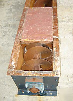 12" X 28''- 4" CARBON STEEL SCREW CONVEYOR: 12" DIAMETER SCREW X 28'-4" LONG. 3/16" THICK CARBON STEEL FLIGHTS ARE ON 12" CENTERS WITH FEED SECTION FLIGHTS ON 6'' CENTERS. OPEN TOP U-TROUGH DESIGN. 13" X 13" DISCHARGE ON DRIVE END. 2" SHAFTING. BALDOR 2 HP MOTOR. CATALOG NUMBER W3558T. SPECIFICATION 35A001T585H1. SER. M0500. FRAME 145T. 208-230/460 VOLTS. 6-5.6/2.8 AMPS. 1740 RPM. 60 Hz 3 PHASE WITH A SERVICE FACTOR OF 1.15. DODGE SHAFT MOUNT SPEED REDUCER. SIZE SCXT-125. PART NUMBER 351164MC 142. CLASS RATING 4.64 HP @ 2179 RPM AND A 25.64 RATIO. MAXIMUM INPUT SPEED 2179 RPM. DRIVE SECTION IS EQUIPPED WITH BELT DRIVE AND DRIVE GUARD. |