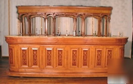 Increase Sales by 18% and double your hits - Vendio Gallery 13 Ft French Oak & Walnut Inlaid Marquetry Front Back Pub Bar w/ Marble Top Thousands of items in stock!! Containers arriving weekly WE MATCH COMPETITOR'S PRICES!!! Dimensions taken at furthest points. 13 Ft French Oak & Walnut Inlaid Marquetry Front Back Pub Bar w/ Marble Top This means extra savings for those living in the Western States and New York. The 20% discount does not apply to blanket wrapped items. PRODUCT IMAGES AND DESCRIPTION CLICK THE IMAGE BELOW TO VIEW MORE SUPERSIZE PHOTOS IN OUR GALLERY 13 Ft French Oak & Walnut Inlaid Marquetry Front Back Pub Bar w/ Marble Top CLICK THE IMAGE ABOVE TO VIEW MORE SUPERSIZE PHOTOS IN OUR GALLERY Product Number: MBWEK4LBAR13FT-g Dimensions: 95H x 156.5W x 29Depth Dimensions taken at furthest points. This is a gorgeous bar with intricate carvings and beautiful inlaid marquetry. Look closely at the images so you can see just how fabulous this bar is. Make note of the carved columns and elegant design. While this bar is very ornate, it is also very classy. The bartender width is up to you and the front bar is crowned with a beautiful piece of variegated cream with slight brown tones beveled marble. Please note the front bar still has the manufacturer''™s wheels and they make the front bar appear unusually high. The wheels will be removed prior to delivery. This bar's marble top has several cracks which we will repair (as best as we can) prior to delivery. If you have any additional questions please contact us. * French Oak and Walnut Finish * Intricate Inlaid Marquetry Panels * Strict Attention To Detail * Kiln Dried Wood (8% Moisture Content) * Genuine Italian Marble Top - Not Synthetic Marble * High Quality American Mahogany Veneers * Very High Quality - Built To Last Generations * Hand Crafted; Not Mass Produced * Please compare Apples to Apples When Shopping Front Bar Upper Drinking Ledge: 47H x 29D x 151.5L Front Bar Lower Serving Ledge: 42H Rear Bar: 95H x 20.25D x 156.5L Shelves Front Bar: 6 @ 17H x 23D x 33L Shelves Front Bar: 4 @ 17H x 23D x 18.5L Shelves Back Bar: 6 @ 17.5H x 17.5D x 33L Shelves Back Bar: 4 @ 17.5H x 17.5D x 18.5L Front Bar Counter Height Upper: 47 Front Bar Counter Height Lower: 42 Back Bar Counter Height Lower: 43.75 Construction: Our reproduction furniture is known for its elegant designs, ornate carvings, beautiful bombe shapes, brass ormolu mounts, marble tops, intricate marquetry inlays and decorative veneers. This is top quality furniture made by craftsman with skills not available elsewhere. These pieces are handcrafted in a workshop, not mass produced in a factory. Typically the underlying wood of each piece is made of beechwood and covered with mahogany, walnut, or natural burl veneers. Often the veneers are inlaid with banding and beautiful floral or Venetian marquetry. The marquetry will contain woods with contrasting colors and grains like oak, walnut, mahogany, lemonwood, rosewood, or peachwood. You may also find pieces with hand painted accents on French reproduction furniture. It is not unusual for these pieces to contain some structural plywood in the underlying wood or drawers. When working with veneers, it is important that the wood not expand, shrink or crack and quality plywood is inherently stable and creates a valuable, beautiful piece of furniture that will last a lifetime. ASK US ABOUT OUR LOW PRICE GUARANTEE! ©2002 - 2006 MBW FURNITURE, INC. |