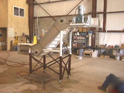 | ITEM 1701-01; -02: 18" WIDE X 84" LONG CLEATED INCLINED BELT CONVEYORS: 1 HP, 115/230 VOLT DRIVE; GRIFFIN & CO SERIAL NUMBER 90295-01; JOB # 90295, DATED 12-31-90. POCKETS IN BELT ARE 18" WIDE X 7" LONG X 2.5" DEEP. WHITE NEOPRENE BELTS. STAINLESS STEEL SIDEWALLS AND OTHER CONTACT PARTS. EXCELLENT CONDITION. DIACHARGE HEIGHT IS 37". WE HAVE STANDS FOR THESE CONVEYORS THAT GIVE YOU APPROXIMATELY A 7 FOOT DISCHARGE HEIGHT. |