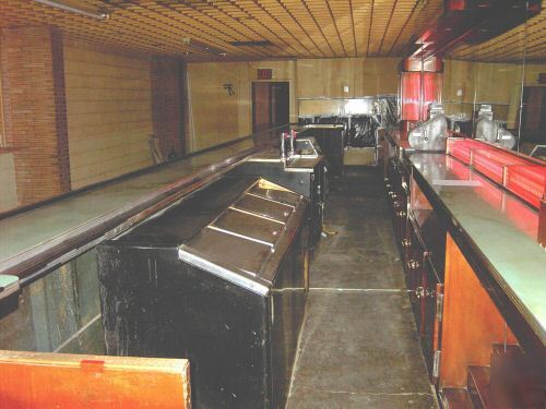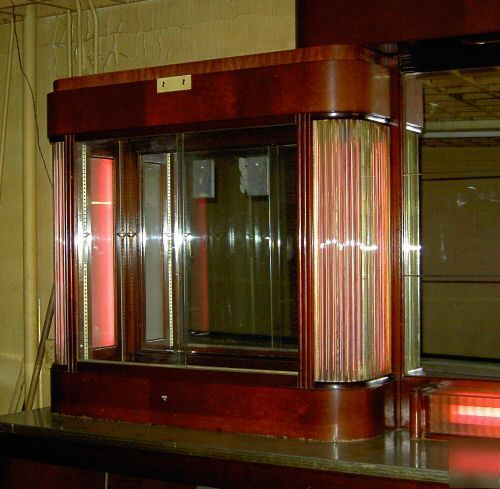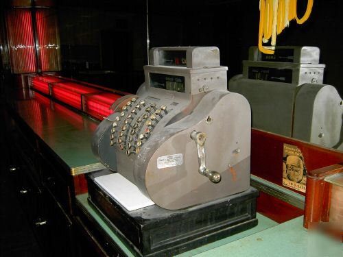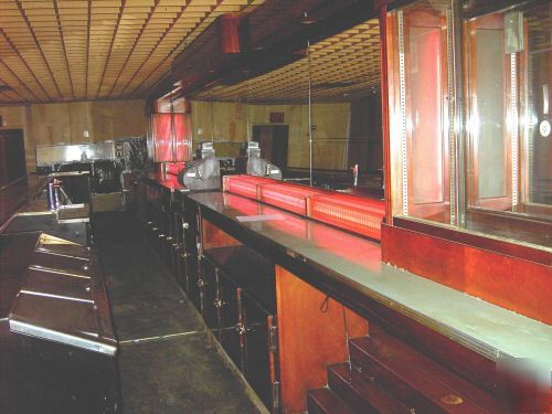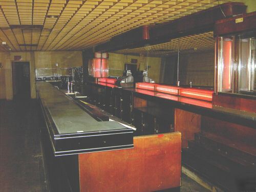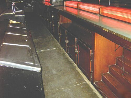 This ART DECO BAR CIRCA 1930-1940, was CUSTOM DESIGNed BY THE HARRY L. HUSSMANN COMPANY OF EL PASO, TEXAS, FOR THE LEGENDARY LIQUOR STORE MAGNATE AND PHILANTHROPIST, TOM “PINKIE” RODEN. PINKIE HAD THE BAR CUSTOM BUILT FOR HIS FIRST LOCATION OF THE “GOLDEN ROOSTER” PRIVATE CLUB IN THE BOOMING OIL FIELD TOWN OF ODESSA, TEXAS. THE CLUB WAS LATER MOVED TO THE ‘INN OF THE GOLDEN WEST’ IN EARLY 1070. THE BAR REMAINED AT THE ORIGINAL LOCATION AND WAS IN USE UNTIL 2002. THE BAR IS APPROXIMATELY 40 FEET IN LENGTH, AND DISMANTLES INTO 3 PARTS. THERE IS ALSO A LIGHTED GLASS AND MIRROR SHOWCASE BEHING THE BAR, WHICH DISMANTLES INTO 3 PIECES. THE TOP SURFACES ARE COVERED WITH FORMICA AND THE OTHER AREAS HAVE MAHOGONY PANELING SURFACE. There are 10 wooden door storage cabinets under the lighted showcase, a 4 door cold storage box and two beer tap dispensers behind the regular bar. There is an antique NCR cash registure (serial #2469791 110 volt) it is a series 900 and has a plate on the front with 842b-xx. the registure was at the original Golden Rooster Club. |