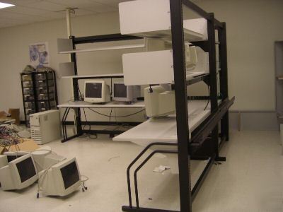 Heavy Duty Full Size L Configuraation Modular Network Data Center • Full frames support multiple width components • Data Center Size is 10’ x 10’ “L Corner System • Reverse I-beam construction • Constructed with 12 gauge steel • Superior leveling capability • Components are reconfigured in 1" increments • Unique trapezoid shaped hooking mechanism • Oversized vertical cable management • Double-strength welded frame • Subdivided frame with many components • Electrical isolation and ESD control • Integrated cable management • ANSI certified performance • Originally a lifetime manufacturers warranty product Technical furniture describes modular furnishings that are exclusively designed for IT hardware support and labs. We mean furniture for the high-tech industry that is adaptable, functional and designed to manage the technology that you service, test, monitor or produce. These furnishings differ from conventional shelving, racks and tables. Wright Line is a global leader in the design and manufacture of technical furniture and enclosure systems, has served the information technology, office, engineering, and high-tech manufacturing environments for 70 years. Our innovative designs are manufactured to the highest quality We have used our best efforts to inspect the item(s) for sale and create descriptions and furnish photographs that fairly and adequately depict the type, condition and image of the goods at the time of sale. We makes no express or implied warranties or representations regarding the condition or suitability of the goods and to the extent allowed by law, specifically disclaims any express or implied warranties, including but not limited to any warranty of merchantability or fitness for purpose. All rights reserved. |