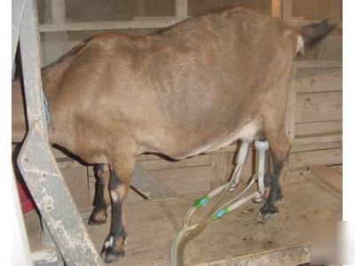 Features a quiet portable vacuum supply with Industrial Grade pump for long life and low maintenance. 3/4 HP motor runs on 110 volt household current. Comes standard with 2 - 7 gallon crystal clear plastic buckets (stainless steel buckets optional), 2 lids, 2 pulsators, 4 sets of milker claws, 4 set of clear plastic shells, 4 sets of inflations, milk and vacuum hoses. Clear Milk Buckets have weigh scale in pounds and gallons. Just add oil to the pump, and it is ready to use. 1 year warranty. 501-004 Complete Bucket Milker for milking 4 goats at a time , with vacuum supply, 2 plastic buckets set up to milk four goats at a time..... sale $2395.00 + freight. Upgrade; Add $195 for 65 lb stainless steel buckets instead of plastic buckets. Upgrade; Add $260 for 80 lb stainless steel buckets instead of plastic buckets. See separate listings for 1 at a time milker or 2 at a time milker. |
