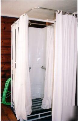 This is a temporary shower unit. It can be installed anywhere without any permanent modifications to your home. No building permits are required, and installation can be performed by anyone with basic handy man skills. Only basic hand tools are needed to assemble. The base and frame are made of structural steel, while the shower pan and drain basin are made of stainless steel. The shower drain pan has anti-slip strips. The interior walls are cushioned and lined with a heavy gauge, water, mold, and rot resistant material. Inside, the shower is equipped with an industrial water supply valve, and a water saver showerhead. Two of the walls have safety bars, and there are interior and exterior safety handles along both sides of the entry. You can change the location of the entry from the front to either one of the sides. There is a privacy area for changing, and the shower sits on a three foot by four-foot waterproof carpet. The unit has it’s own ground fault circuit interrupter, and the power supply is both 110 and 24 volt. It also has a 60-minute timer to insure that the shower will shut, off even if it is left on. The system also features 24-volt water solenoid valves to shut off the water supply in the event of a power outage, or if the water level rises to high in the drain basin. All of the fittings needed to connect to your existing water supply, along with 50 feet of hot and cold water supply hose are included. The unit comes with a water discharge system. The discharge system is capable of discharging the wastewater up to 50 feet away and up to 5 feet in height. The system includes a stainless steel drain basin, an adjustable float switch, discharge pump, and 50 feet of discharge hose. Shower water is considered gray water. Gray water does not have to be plumbed into your drainage system. Shower water can be pumped into any existing house drain; it can even be discharged outdoors. Simply place the end of the discharge hose into any sink, or toilet. It can also be drained into the drain line for your washing machine, or onto a floor drain. You can also use a dishwasher drain attachment. The standard unit is 32 inch, but custom size is available upon request. Longer supply and discharge hose lengths are available upon request, but the pump size may have to be increased. “Your Living Solutions LLC” brings this product to you. Email to , or call . |