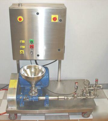 Manufactured by Sonic Corporation (sonicmixing dot com) This unit was used for sample batches - it has processed less than 20 gallons of product. It is in Brand New Condition. 316 Stainless steel components. Processes up to 1 gallon per minute Electronics: Hitachi variable frequency drive mounted in a Nema 4X stainless enclosure on the frame. Pressure transmitter. Power disconnect knob, Potentiometer, Start/stop switch. Pump inlet furnished with a 1 gallon stainless steel funnel. This unit came wired for 3 Phase 220 power- it is currently set up to run on Single Phase 220. Can be switched back and forth very easily. This description of the Sonolator is from Sonics website: "All types of mixers achieve mixing by rapidly changing the direction the fluid, accelerating the fluid, or subjecting the fluid to cavitation. Rotating props or high shear rotors force fluids to change direction and cavitate; static mixers use direction change. The Sonolator is an in-line, continuous, high pressure homogenizer that subjects fluids to high pressure, extreme acceleration and ultrasonic cavitation by forcing the material through our engineered Orifice. The material is forced by a PD pump through the Orifice and is accelerated to greater than 300 ft/sec. The fluid cavitates as vortices of are violently spun off in the opposite direction of the flow. We harness this cavitational energy by then forcing the material to strike a knife-like blade set in its path. Vortices of material are spun off simultaneously forming a pulsating cavitational field around the blade. This extreme fluid acceleration and cavitation allow for very effective mixing, homogenizing, emulsifying and dispersing." This unit comes with two different orifice attachments allowing for different specific particle sizes. Original crate was 53" X 42" X 49" - New crate will be similar. Freight should be between $200 and $400 depending on your location. I have all the original manuals and paperwork for all the components This is a VERY nice unit! It works amazingly, and the people at Sonic are FANTASTIC. Im sure that whatever your intended use, the folks at Sonic will advise and direct. Call BJ at if you have any questions or you can email me . |