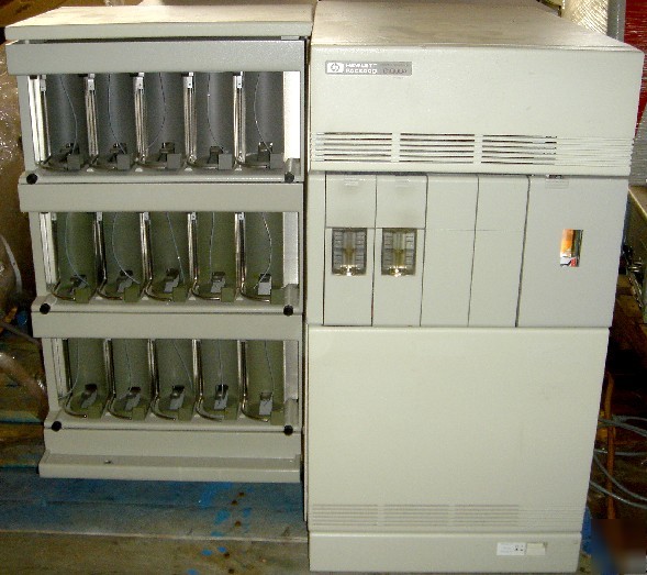 HP G1000A Automated Protein Sequencer Automated Edman chemistry is performed on a Hewlett Packard G1000A Automated Protein Sequencer. The G1000A is a complete, automated chemistry and analytical system for amino acid sequence analysis of protein and peptide samples in picomole to nanomole amounts. The system is composed of the G1000A Protein Sequencer, an on-line PTH-amino acid analyzer based on the HP 1090 HPLC and a system controller for coordinated, single-point control. The G1000A Protein Sequencer performs automated Edman sequencing chemistry on a miniature, biphasic, C18 resin-packed column sample support. The reagent delivery system includes a bi-directional flow path, facilitating the design of chemical methods that exploit the surface properties of the column packing material and the polarities of the reagents, solvents, and sample. Optimal sample amount is in the range 20 - 100 pmol , although sequence can be obtained from less than 10 pmol initial yield. Some researchers have achieved over 100 residues have been sequenced from some purified native proteins with the later amino acids identifiable at the subpicomole level This unit is in great physical condition, normal scratches from use (see pictures). Unit powers on and seems to function fine, but due to the nature of the equipment we are unable to fully test it and all observations are for informational purposes only - so it is being offered AS-IS. Please feel free to email with any questions. Works great, with a good physical appearance. Questions? Comments? Please Email Me! |
