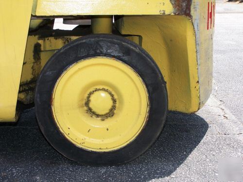 You are looking at a Hyster forklift truck. This machine runs and operates great. Comes equipped with drive lights, backup alarm and fire extinguisher. Hand brakes and horn work. No leaks on the floor. No smoke from the engine. This machine is ready to use. Hours are reasonably light and the lift appears to have been maintained well. The capacity is 10,000 pounds but the data plate reads less (about 6500 pounds) due to the attachement that was originally on the lift. Auxillary hydraulics are in place for sideshift or other attachment. Maximum lift height is 206". Lowered overall height is 100". Width is 56. Length not including forks is 108". Feel free to call us toll free at and ask for Hal or Ron. Or, you can stop by our location near Greenville SC for a test drive. |