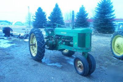 this is a very straight 50's vintage johndeere 50 . they just dont run any better than this one!!! we put a new manifold on and rebuilt the carb clutch works real nice, rubber has some wheather cracks but are still good. the sheet metal is very nice and the way it runs is even nicer there is a crack in the pto housing i welded it up and brushed some paint on it and the pto works just fine i do offer a painting service as well |