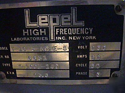 For sale is one Lepel induction power supply, model T-10-3-KC-E-S. We have used this unit extensively over the years to melt ingots of steel, aluminum alloy, nickels, kovars, and so on. It can also be used to anneal barstock and zone refine metals. According to the manual, it can also be used for hardening, stress-relieving, soldering, brazing, and a host of other uses. The unit is in good working shape and has been well cared-for. It comes with several extra copper-tube heating coils and an operation manual. The unit requires 100 amp 3-phase power input, and a tank of de-ionized water for cooling. The weight is about a thousand pounds (I'm just guessing, here). It's a 5' cube, on castors. Any other questions, please contact me: Charles Albert, ACI Alloys, . |