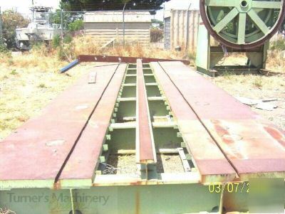 Specifications are as follows: HEADSTOCK, 10' X 20' BASE PLATE, AND ADJUSTABLE IDLERS FORMERLY USED FOR ROCKET AND ROCKET SILO MANUFACTURE DESCRIPTION: POWER TANK TURNING HEADSTOCK WITH 6 IDLERS PLEASE MAKE CHECK, OR MONEY ORDER, CASHIER CHECK PAYABLE TO: Turner's Machinery Inc., 109 N. Olive St., Santa Paula, CA 93060 |
