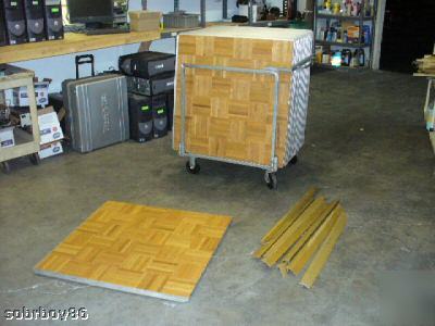 * 200 3'x3' Natural Oak colored panels * 80 Gold colored trim pieces * 8 Panel dance floor caddies ( holds 25 panels each ) * Each Panel weighs approx 38 lbs, 38 X 200 = 760 lbs + Cart & Pallet, Approx 8000 lbs Sico's superior manufacturing process guarantees the squareness of every panel, making set up and take down much easier. This also guarantees that there will be no gaps between panels. All Original Portable Dance Floor panels have 100% floor contact so there is no possibility of breakthrough. The edges of each panel are protected by an aluminum metal feature strip, adding extra years of use and durability. The unique helicoil insert also protects and secures the set screw, prolonging the life of the locking mechanism. More info and pictures are available at the manufacturer website here http://www.sicoinc.com/portable_dance_floor.php Pallet size Standard 48X40X48, 9-10 pallets |