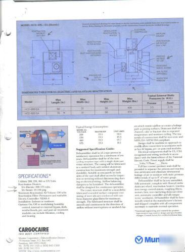 CargoCaire Desiccant Dehumidifier HCD-600 CFM Process Air: Flow rates of 300-1125 scfm. Nominal moisture removal; 16lbs/hr at 75 degrees F, 50% RH at 600 scfm. Delivered air moisture level of -40 degrees F dewpoint and lower are attainable. Excellent condition, almost brand new. This machine has 52 testing hours of use in a trade show. There are two tags on this machine with serial numbers, voltage and model numbers. One is on the electric motor and the other one is on the jet pump. These machines usually come with a factory tag which provides model and serial numbers. As this unit has been used for a trade show by the factory, when I got it, it had plexiglas covering some of the controls, instead of aluminum plates. This was done for demonstration purposes. I suspect that's where the tag was located. If you are familiar with this machine, you may recognize the model. Spec sheets can be viewed next to the photos. The price has been adjusted accordingly. The one on the electric motor reads: Brand name: Toshiba International, Inc., Made in the USA High Efficiency 3 phase Induction, Motor Model B0022FLF2AM01 HP 2, Duty Cont., Encl: TEFC, Ins Class F, Nema des: B, Nema Code K, SF 1.15 Volt 230/480, AMP 5.6/2.8, RPM 3450, Max Amb 40◦ C. The tag on the Jet Pump reads as follows, Century AC Motor, Cat H194, HP 1.0, Volts 200-230/460, Amp 3.2-3.0/1.5, RPM 3450, Hz 60, PH 3, SF 1.15, Part 8-159317-01, Ins Class B Encl TE, Code L, A sales tax exemption certificate will be required if you are a Florida company. (Fax to ) Items purchased for personal use are subject to sales tax for Florida residents only. The best way to contact us is via email (). Our FAX number is . We work Monday through Friday, but we do check the email over the weekend. Thank you for shopping with us! |