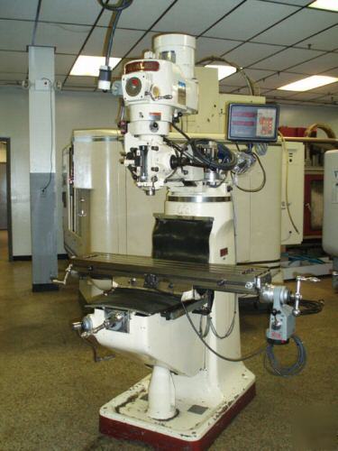 This is a used Chevalier FM 3VS Vertical Knee Mill with a mfg date of 1993. It is variable speed, with a servo power table feed, a 2 Axis DRO and seems to be in good operating condition. This machine was just traded in on a new CNC mill. It has a 9" x 42" table, 3HP and there is a power draw bar with it, but I'm not sure it is complete or operational. The only thing we saw that needs repair is that it needs a new clock spring on the spindle return. Please email with any questions. |