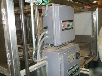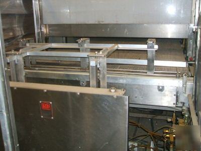 | Refrigerated cooling tunnel for cooling hot filled products like deodorant or candles. This was made by Peterson Machine works in Washington. It has a product infeed pusher and a reciprocating rake to unload the product automatically. It is still under power for your inspection. |