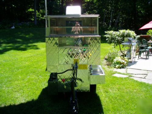 Great For Party's or Events Vending Enclosed Steam Cart Call ext 101 or cell NH Cash will Talk Enclosed 2005 like New with out the $10,000.00 price tag . Custom Hot Dog /Chips / Pretzel / Soup / Chili / Corn on the Cob / Soda / Beer / ice cream / This is the king of carts . Rain or shine snow or just cold this cart will keep you worm and dry.This has passed all health codes in the State of NH. And will pass in all 50 states. NSF approved Cart is D.O.T. approved. Overall size 47" wide, 102" long, 74" high Overall Weight 475 lbs. Unitized Tubular Steel Framing for Extra Strength-Coated with a Military Grade Rust Inhibitor Stainless Steel Construction/Exterior T430 BA Stainless for Easy Cleaning and Maximum Life of Cart Steam One Half Size Pot with Lid One 1/3 Size Pot with Roll Grate and Lid One 1/3 Size Pot with Two 1 1/2 Qt. condiment Pots Inside with Lid Wet Steam Table to Accommodate one 2/3 size Meat Cooking Pot with Lid (on Direct Heat) 3-1/3 Size Pans Over Water Jacket Cold Beverage Section: 26"L x 22" W x 12" D Entire Compartment in Molded Fiberglass with Covered Corners for Sanitary Cleaning Completely Insulated with Urethane to Insure Maximum Life of Ice can last up to 2 days keeps drinks and ice cream cold just slide open top of cooler and reach in to get what you need . All food is safe inside the cart. Capacity- 160 Cans Heat Source: Area for 20lb Propane Tank with Regulator Two 16,500 BTU Each Burner All Propane Burners have 100% Safety Controls Water/Waste System: Three Compartment Sink and 1 hand wash sink both with hot and cold water 2.5 Gallons Hot and 2.5 Gallons Cold Fresh Water Supply 7.5 Gallons Water/Waste Tank for sinks and cooler Wheels: Two Pneumatic Highway Tires on Automotive Type Springs One Front Swivel Wheel (Removable) Large Storage Draws : Storage Draw to Hold Extra Soda, Rolls or Sundry Items ,Money can be locked in draw. Accessories: Two Large Display Cases with Sliding Plexiglas Doors that lock Three Condiment Pots with Lids Recessed in Counter Top Shelving, One 2Qt. Pot with Mustard Stick, Two 2Qt. Pots Wax Paper, Napkin, Bag and Straw dispensers Side Mounted, Removable Trash Container Propane Rack, Regulator and Hose Travel Hitch ( 2" ) inch ball with Lift-up Jack and Removable Front Swivel Wheel. This cart was made to be trailered . """ HAVE CASH WILL TALK """"" NSF approved Cart and trailer is D.O.T "" Cell