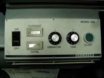ERICHSEN IMPACT RESISTANCE STONE HAMMER BLOW RETAILS NEW FOR OVER $19,680.38!!! WE HAVE AN OFFICIAL QUOTE SHEET FROM ERICHSEN THAT WE CAN FAX TO YOU ELECTRO PNEUMATICALLY CONTROLLED MULTI BLOW TEST INSTRUMENT FOR CONNECTING TO A 3/8" STATIONARY COMPRESSOR TEST UNIT CONSISTING OF SHOT JET UNIT W/ AIR VESSEL PRESSURE REDUCTION VALVE FOR A WORK PRESSURE OF 1-4 BAR AND ACCELERATION TUBE ADJUSTABLE VIBRATORY FEEDER FOR FEEDING IMPACT PARTICLES OPERATORS CONTROL PANEL WITH MAIN SWITCH, FEED TIME ADJUSTMENT SWITCH FOR INITIATING THE STONE HAMMER BLOW TEST AS WELL AS OVERALL AND TEST SEQUENCE MANUAL SPECIMENT APPLYING DEVICE COMPRESSED AIR CONNECTION: MIN 6 BAR USING 13MM ID DISPLAY OF WORKING PRESSURE: 100MM DIA. PRESSURE GAUGE TIME OF FEEDING SHOT: 5-30 SECONDS WE HAVE A BROCHURE THAT WE CAN FAX YOU IF YOU WOULD LIKE PLEASE CLICK THE FOLLOWING LINK FOR MORE INFORMATION: http://www.pearsonpanke.co.uk/da/16571 For packaging 1-149 pounds click the below brown letters link For packages OVER 150 pounds or more use click onto the below blue USF HOLLAND link calculator Enter 49444 in the Origin field Enter your destination Zip Code in the Destination field Enter 45% in the Discount % field Enter the weight of the product in the Weight field Press the Get rate quote button NEW AND PREOWNED EQUIPMENT OF MANY TYPES. WE DO OUR BEST TO DESCRIBE OUR PRODUCTS WITH ALL GOOD AND BAD OF THE ITEMS. WE WILL DESCRIBE TO YOU ANY FLAWS OR DEFECTS TO THE ITEM TO MAKE TOTAL SATISFACTION AND IT WILL BE MADE RIGHT TO YOU. OUR NORMAL WARRANTY POLICY FOR ITEMS IS USUALLY 15 DAYS FROM PURCHASE, BUT IF YOU HAVE A PROBLEM PLEASE FEEL FREE TO CONTACT US FOR ANY HELP WE CAN EXTEND TO YOU. ON ELECTRICAL ITEM WE WILL WARRANTY THEM FOR NOT BEING DEAD ON ARRIVAL (DOA). AFTER THE WARRANTY PERIOD IF SOMETHING SHOULD GO WRONG PLEASE CALL. WE WILL TRY TO HELP YOU WITH A REPLACEMENT PART IF IN STOCK. WE ARE HERE TO SERVE YOU AND BY DOING SO WE WILL STAY IN BUSINESS FOR MANY YEARS IN THE FUTURE. ANY AND ALL EQUIPMENT OR ITEMS PURCHASED FROM US, MUST BE UNLESS ARRANGEMENTS HAVE BEEN MADE WITH US AT OR BEFORE SALE DATE. AFTER THE 30 DAYS A SMALL SQUARE FOOTAGE RATE WILL BE IN AFFECT FOR ANY QUESTIONS OR CONCERNS PLEASE CALL TOLL FREE CELL 24 - 7 ASK FOR |