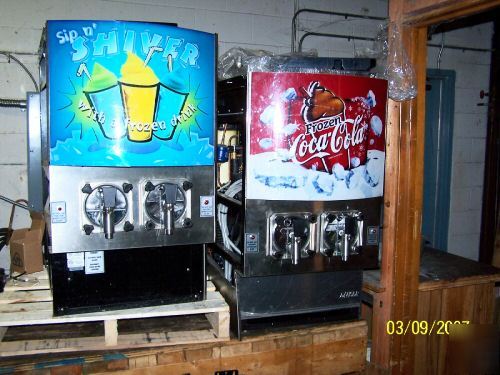 Select Distributing - Nashville,TN Mike Specs and Service Manual 3.1MB : www.fbdfrozen.com/fbd/technical_support/pdfs/2402760001.pdf We had these machine out on rental and they have less than 1 years use. We are reorganizing and focusing on ice cream business so we are moving these out. Syrup sells for about $10 per gallon. Mixed with water and air, one gallon makes 1267 ounces or 105 twelve ounce drinks at $1.00 |