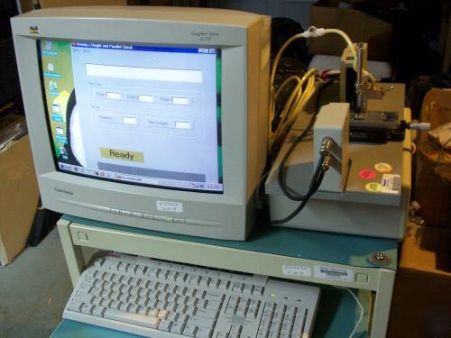 Keyence LS-3100 Laser Micrometer with the LS-3060 Laser Scanning Heads and computer system This is a Laser Micrometer Measurement System. * RS-232C interface; control i/o * Visible laser-wavelength 60nm * Scanning head: Model LS-3060R * Separate transmitter & receiver * Distance between T & R: 200±50mm * Minimum target width: 0.8mm * Number of averaging measurements * Storage of up to 10 tolerances and parameter settings For complete Keyence documentation, please see http://www.keyence.com/dwn/ls_3100_man.pdf This equipment consists of the Keyence LS-3100 Laser Scan Diameter Unit, the LS-3060 Laser Heads with micrometer mount, an MCW Computer running unknown programs and applications, a ViewSonic G773 monitor, a keyboard, a mouse, and the associated cables to interconnect the Keyence Scan Diameter unit with the computer. The pictures show the actual item as you will receive it. This item appears to be in good physical and electrical condition, however, it is being sold "AS-IS". I have tested this unit to power up. We are unfamiliar with this equipment, but we will perform any tests that you may require. This unit was removed from a working environment where the Fortune 500 business was liquidated. Please see the pictures for all details as to what is included. THE CART THAT THE EQUIPMENT IS DISPLAYED ON IS NOT INCLUDED! Good luck and thank you for looking! * California purchases are subject to 8% California sales tax * All items are sold "AS-IS" and in the condition described unless specified otherwise. |