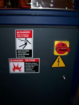We have three large pieces of Lantech shrink wrapping equipment. We purchased them to lease to a contract packaging outfit that, no sooner than they got going, lost their contract with a large media producer. These units each have less than 1000 hours of use on them are are about as near to new as you can be without actually still being new. Their condition is very good and are fully functional. Each was installed by our Lantech trained technician who also trained the operators. This is a significant opportunity to acquire premier equipment at a remarkable price. Please contact me with any questions. SW-2000 Continuous Motion, Belted Infeed, Side-Seal Shrink Wrapper Lantech's revolutionary SW-Series shrink wrapper operating features eliminate common shrink wrapping complaints. Poor shrink package quality is often the result of non-intuitive mechanical adjustments; dependence on precise time, speed and temperature control, and changes in seal quality due to dirt and/or film build-up. Rework from poor package quality and downtime from time consuming changeovers have a significant impact on productivity levels. Lantech's SW-Series Shrink Wrapper is designed to address all of these issues and more. Production Size (L X W X H) Min *note: Maximum dimensions MAY not run simultaneously Most Commercial grade Polyolefin, PVC, LDPE. Some films may require change parts. Mechanical with Electronic Tension control Adjustable Film inverting Head Top level access to primary machine functions, changeable without stopping machine Password Protection (3 levels) Easily store and recall up to 16 basic recipes Diagnostic and maintenance features Electronic collapse and product spacing (no mechanical variator) On demand operation - automatic product Spacing Swivel mounted HMI accessible from both sides of machine |