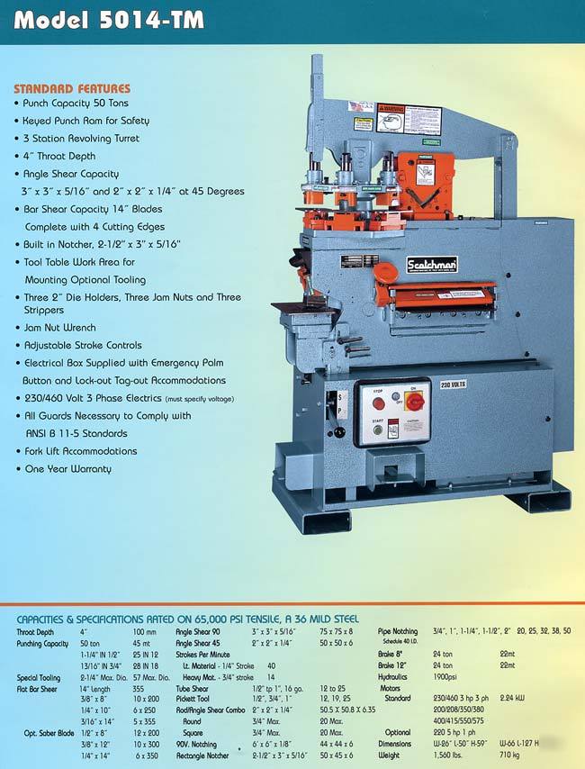 Used Machinery and Machine ToolsUsed MachineryUsed Machine ToolsThousands of Used Metalworking and Plastic Machines & New Machine Tools Photos, Full Descriptions and Prices - Fast & Easy * Manual Lathes, Mills, Drills, Saws * Grinders, Hones, Finishing * Ovens, Furnaces & Environmental 50Tn NEW IRONWORKER, Scotchman 5014-TM FREE D 50Tn NEW IRONWORKER, Scotchman 5014-TM FREE D SCOTCHMAN IRONWORKER, MODEL: 5014-TM 3" X 3" X 5/16" AND 2" X 2" X 1/4" AT 45 DEGREES -BAR SHEAR CAPACITY 14" BLADES COMPLETE WITH 4 CUTTING EDGES -BUILT IN NOTCHER, 2-1/2" X 3" X 5/16" -TOOL TABLE WORK AREA FOR MOUNTING OPTIONAL TOOLING -THREE 2" DIE HOLDERS, THREE JAM NUTS AND THREE STRIPPERS -ELECTRICAL BOX SUPPLIED WITH EMERGENCY PALM BUTTON AND LOCK-OUT TAG-OUT ACCOMMODATIONS -230/460 VOLT 3 PHASE ELECTRICS (MUST SPECIFY VOLTAGE) -ALL GUARDS NECESSARY TO COMPLY WITH ANSI B 11-5 STANDARDS CAPACITIES & SPECIFICATIONS RATED ON 65,000 PSI TENSILE, A 36 MILD STEEL: THROAT DEPTH........................ 4" PUNCHING CAPACITY................... 50 TON SPECIAL TOOLING..................... 2-1/4" MAX. DIA. FLAT BAR SHEER...................... 14" LENGTH OPT. SOBER BLADE.................... 1/2" X 8" ANGLE SHEAR 90...................... 3" X 3" X 5/16" ANGLE SHEAR 45...................... 2" X 2" X 1/4" LT. MATERIAL........................ 1/4" STROKE HEAVY MATERIAL...................... 3/4" STROKE TUBE SHEAR.......................... 1/2" TP 1", 16 GA. PICKETT TOOL........................ 1/2", 3/4", 1" ROD/ANGLE SHEAR COMBO............... 2" X 2" X 1/4" ROUND............................... 3/4" MAX. SQUARE.............................. 3/4" MAX. 90V NOTCHING........................ 6' X 6" X 1/8" RECTANGLE NOTCHER................... 2-1/2" x 3" x 5/16" PIPE NOTCHING................. 3/4", 1", 1-1/4", 1-1/2", 2" BRAKE 8"...................... 24 TON BRAKE 12"..................... 24 TON HYDRAULICS.................... 1900 PSI STANDARD...................... 230/460 3 HP 3 PH OPTIONAL...................... 5 HP 230v 1 PH (add $345) DIMENSIONS.................... W-24" L-60" H-66" WEIGHT........................ 2,750 LBS Machine Location: HARRISON, NJ Click Here For More Scotchman Machines Click Here For More Fabricating Machine - NEW IRONWORKERS(s) Call Kori at ext 7555 Call Alex at ext 7613 Finance This Equipment For Your Business - Click Here Finance Equipment For Your Business - Click Here * Machinery Values is one of the world's largest machinery dealers, in business since 1971. * New machines are covered under their own warrantees. Details of each warranty can be found within the quotation for all new machines. * Most items in our store are located in our warehouse in Harrison, New Jersey - about 9 miles from New York City. You may inspect any item prior to purchase, under power in most cases, simply by calling and arranging an inspection. There is no charge for this. Summary of My Selling Policies Machinery, Tooling and Accessories used in manufacturing are usually exempt from sales tax in our state (New Jersey). A sales tax exemption certificate may be required if you are a New Jersey company. Equipment purchased for personal use is subject to sales tax if you are a New Jersey resident. Read my policies on my SquareTrade Seal |