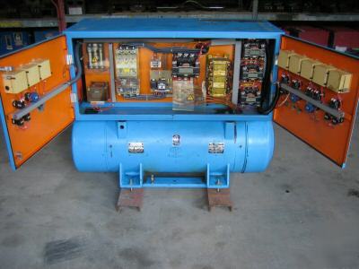 This Pillar 75 KVA 400 Cycle generator is driven by a 460 V motor. The motor and generator are together (intregal) as one unit. The control panel is on top of this unit and is also complete including a Klockner-Moeller breaker. This unit came out of an airplane manufacturing plant (located in an environmentally controlled room) and was used in conjunction with three other similiar units for testing. This unit and the other units were used very little. We have another unit available with slightly bent upward front doors. Both units do not include a Hertz / Hz meter. - p.f. 0.9 (so generator is 0.9*75 = 67.5 KW) VDE 0530 BEARING 6314C3 1.37 t SHELL ALVANIA R3 OR CYPRINA RA After 4000 h 29 cm3 relubricates Inside Door / Control Panel Nameplate - Control Cabinet VA 8 42 7242 No. 1.325/45 - Machine VA 8 33 4792 No. 142/942 - Input-Mains: 460 V 123 A 60 Hz - Output 208/120 V 208 A 415 Hz If you need more photos I can send them to you. If you have any questions, I will do my best to answer them. Please be as specific as you can. Our business has been in operation for over 20 years. |