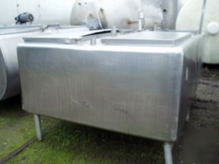 | Tank, 800 gallon, stainless steel construction, (2) individual compartments. Each compartment has a capacity of approx.400 gallon and measures 4' wide x 5' 4" long x 2'7" deep, with 2 hinged lids, 1-1/2" diameter bottom side outlet, top openings: (2) 1-3/4", (2) 2-1/2", (2) 1", (2) 1-1/2". On legs. Good condition. |