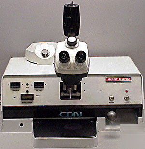 West Bond 7400IW Wire Bonder with StereoZoom 4 Scope * West Bond 7400IW Ultrasonic Wire Bonder * Cambridge Instruments Stereozoom 4 Microscope 0.7x to 3.0x zoom, with Baush & Lomb 10x W.F. eyepieces * Leica model 13410311 Illuminator * Light Source with good bulb * Our 14 Day Guarantee Against DOA (Dead On Arrival) does not guarantee compatibility. * If something is listed AS-IS, there are absolutely no returns, refunds, or exchanges. * The warranty period starts from the day the item is received. Click here for authorization form * We do not accept American Express * Cashier's Check/Money Order * Company Check (10 business-day hold) * hours: Monday-Friday 9:00am-5:30pm CST * address: 12510 Trails End Rd Leander TX, 78641 |