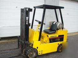 WHITE 5000 Lbs. PROPHANE FORKLIFT WHITE 5000 LPG FORKLIFT. AUTO TRANS, SOLID TIRES VERY GOOD CONDITION, HAND BRAKE, TANK NOT INCLUDED, NEEDS NEW SEAL ON ONE RIGHT SIDE OF FRONT PISTON OF LIFT (LEAKS ALITTLE), NO SIDESHIFT, 106" MAX HEIGHT. PICK UP ONLY. WE HAVE TWO LIFTS NOW. LIFT IS UNDER POWER AND STILL IN USE. WE ALSO HAVE PARTS MANUAL AND OPERATION MANUALS. CAN BE SEEN IN TOMS RIVER, N.J. Click to view supersized image Click to view supersized image Click to view supersized image Click to view supersized image supersized) with Vendio Sales Manager. Smart Services for Smart Sellers Listing automation and FREE scheduled listings by Vendio. Free counters provided by Vendio |